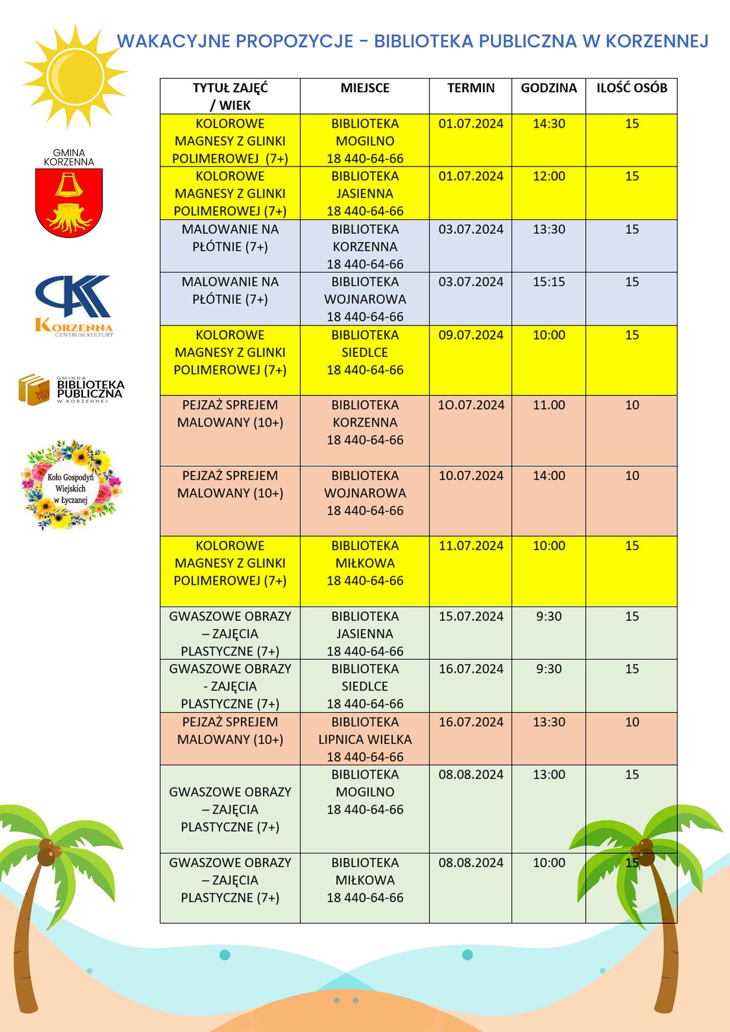 Zainteresowani będą mogli skorzystać z zajęć organizowanych przez GBP w Korzennej, które poza Korzenną odbywać się będą w filiach bibliotecznych w Wojnarowej, Siedlcach, Jasiennej, Mogilnie, Miłkowej i Lipnicy Wielkiej. Biblioteka przygotowała zajęcia głownie plastyczne takie jak malowanie sprayem, malowanie techniką gwaszu i malowanie na płótnie. Spotkania zaplanowano przez 10 wakacyjnych dni, a liczba ich uczestników jest ograniczona.