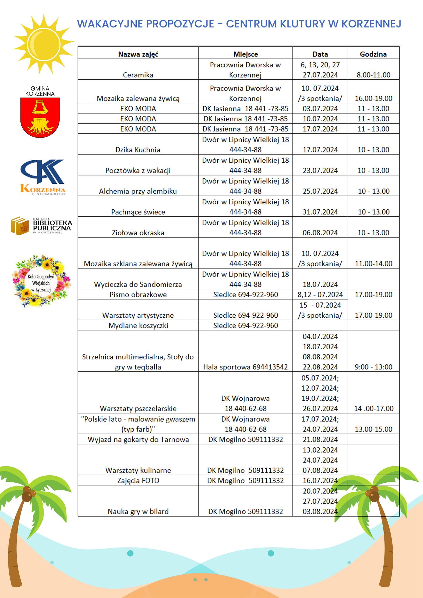 Centrum Kultury w Korzennej przygotowało dla dzieci harmonogram zajęć, obejmujący grubo ponad 20 wakacyjnych dni. Prowadzone będą w domach kultury w Korzennej, Jasiennej, Siedlcach, Wojnarowej, Lipnicy Wielkiej, Mogilnie, a także w hali sportowej w Korzennej. Program obejmuje zajęcia z ceramiki, różne techniki rękodzielnicze, warsztaty artystyczne i kulinarne, warsztaty pszczelarskie. Zaplanowano ponadto zajęcia sportowe (strzelnica multimedialna, nauka gry w bilard), fotograficzne oraz wyjazdy do Sandomierza i do Tarnowa na gokarty.