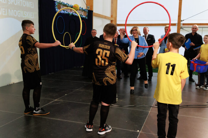 Najbardziej oczekiwaną częścią uroczystości był moment symbolicznego otwarcia obiektu. Uczniowie unieśli w górę kółka olimpijskie, a zaproszeni goście próbowali trafić w nie małymi piłkami. Chociaż z celnością było różnie, to ostatecznie uznano, że oficjalne otwarcie hali stało się faktem. Tuż potem proboszcz parafii w Mogilnie, ks. Emil Myszkowski, poświęcił obiekt.