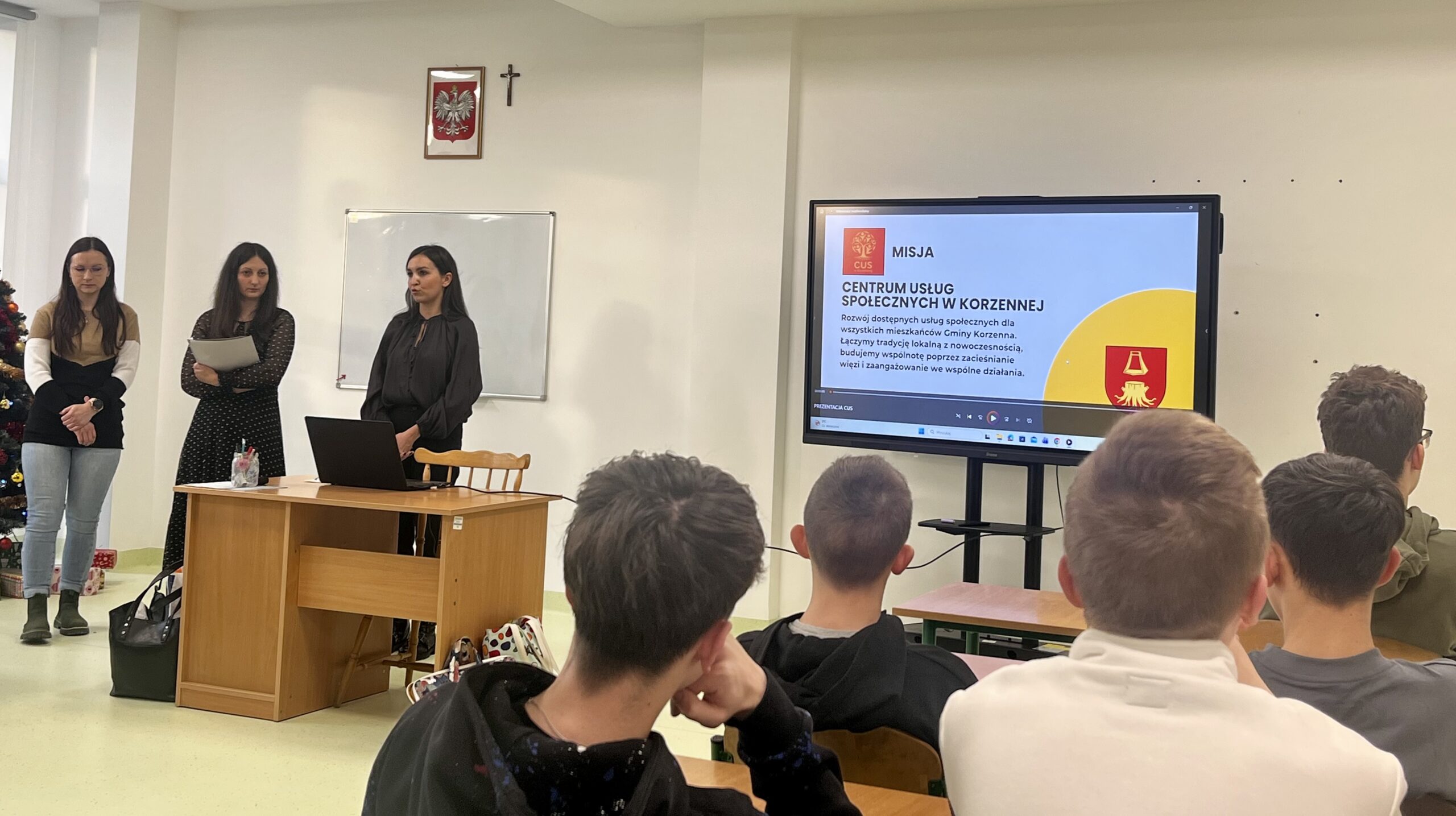 Na zaproszenie dyrektor szkoły Anny Kity placówkę odwiedziły przedstawicielki Centrum Usług Społecznych w Korzennej. Barbara Groń, Ewelina Zielińska oraz Justyna Basta opowiedziały, na czym polega rola utworzonej niedawno instytucji. Podkreślały, że generalnie łączy ona działania z zakresu pomocy społecznej, wsparcia rodzin i integracji lokalnej.