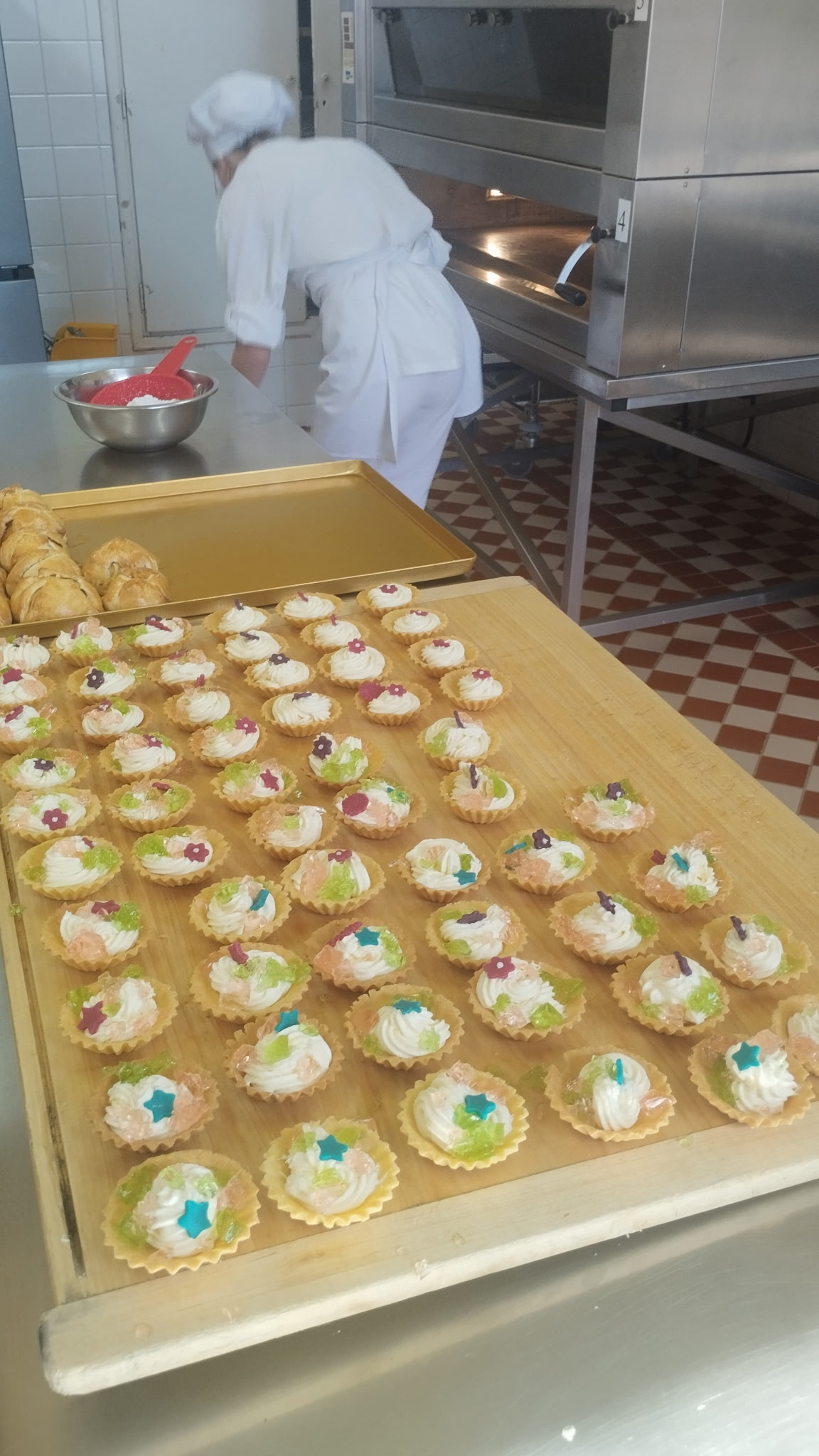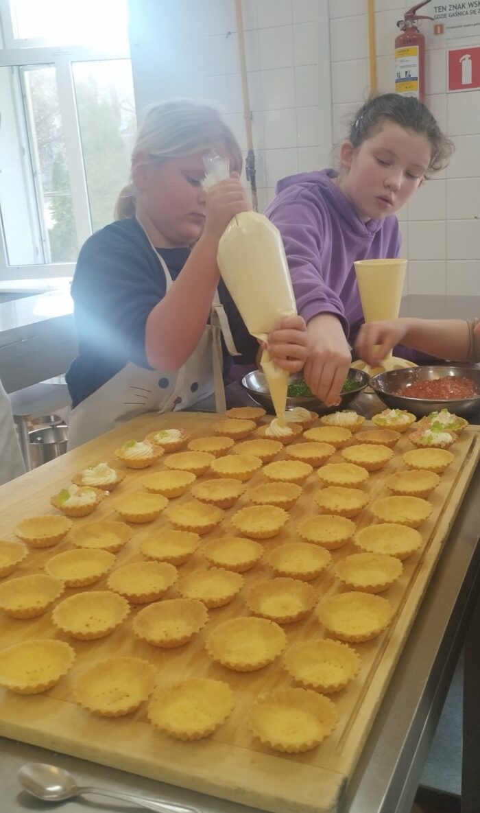Uczestników warsztatów podzielono na pięć grup. Współpracując z maturzystkami przygotowywali babeczki, ciastka kruche oraz drożdżówki. Każdy etap pieczenia był okazją do nauki – od wyrabiania ciasta po dekorowanie gotowych wypieków. Dzieci mogły obserwować, jak wygląda codzienna praca cukiernika, a także spróbować swoich sił w praktycznych zadaniach. Zanim wyroby trafiły do pieca starannie je dekorowano.